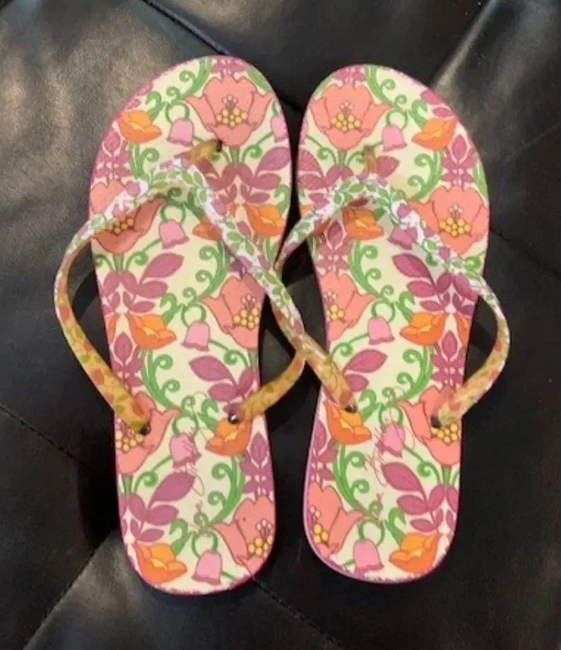 Vera Bradley Lilli Bell pattern (retired) pink floral flip flops are on a cream background with ligh... Show more