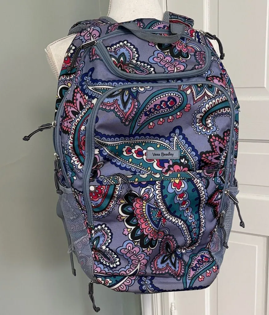 Chic Vera Bradley backpack with a vibrant paisley pattern. Features blue and pink colors. Ideal for... Show more