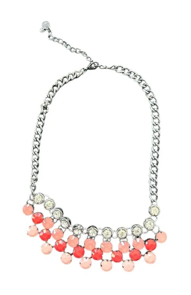 Add a touch of elegance with this stunning silver and pink necklace. Perfect for any occasion.