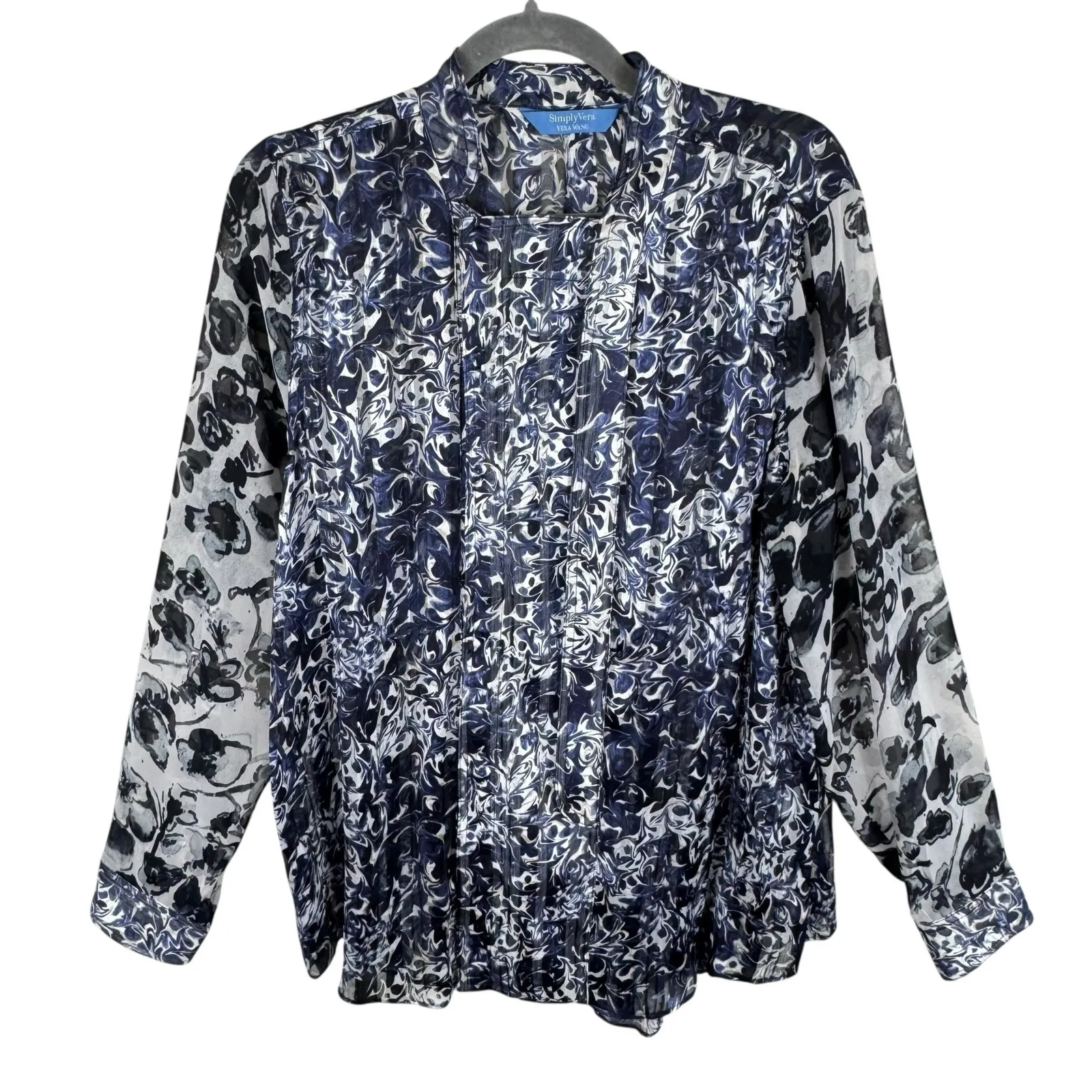 Excellent preowned condition. Blue, black, & cream patterned long sleeve lightweight sheer hidden sn... Show more