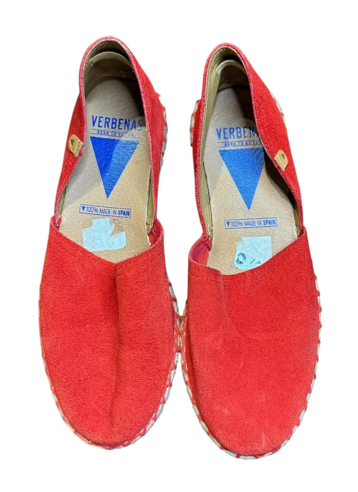 Brand: Verbenas Style: Womens slip-on espadrille flats with jute-wrapped midsole and rounded toe. Color: Red upper with natural jute trim and beige rubber outsole. Size: Womens US 6.5, EU 37, UK 4; standard width. Materials: Suede leather upper, leather insole, man-made rubber sole. Made in Spain; insole printed "VERBENAS BORN TO BE FUN" and "100% MADE IN SPAIN"; inner side stamp reads "LEATHER UPPER MAN MADE SOLE RN# 5341". Details: Easy slip-on construction, espadrille-style braided trim, lightly cushioned insole, casual everyday comfort flats.