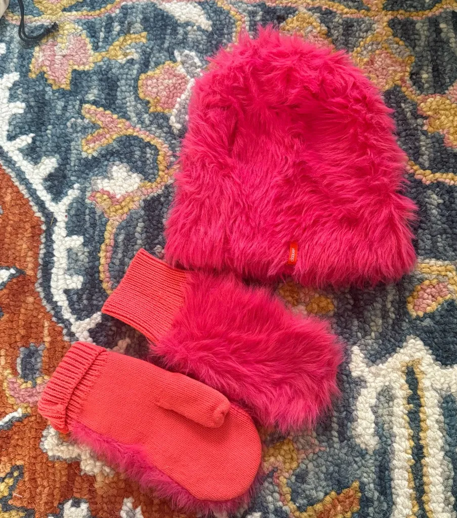 . Hat - A classic knit beanie updated with fuzzy faux fur texture. Naturally stretchy for an easy, cozy fit. Made from fluffy, colorful hypoallergenic yarn. Can be worn as a cuffed, rolled, or slouchy winter hat. Unisex/one size. 50% Soft Acrylic, 50% Nylon 9" W x 10.5" L Mittens - Statement-making fuzzy faux fur mittens with soft knit palms and a generous ribbed cuff to keep out the cold. Fully lined, plush, and cozy. Make it a matching set with our faux fur trapper hat, hood or beanie.45% Acrylic, 55% Nylon 3.5"W x 10"L