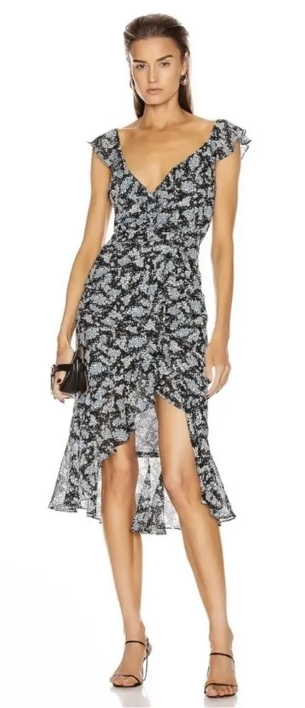 Good preowned condition Veronica Beard's Amal dress works a classic bluebell floral into airy silk crepe. This lightly ruffled midi is fitted with ruching through the side Faux wrap Sleeveless Fully lined Hidden front zip closure with ruffled trim Crossover neckline Gathered ruffled hem Concealed zip closure Hourglass Flutter sleeves V-neckline Front slit detail Fabric: 100% silk Lining: 100% polyester Measurements are approximate and taken with the garment laying flat Chest 18" across Length 46" from shoulder to hem Wedding, bridal shower, baby shower, graduation, cocktail