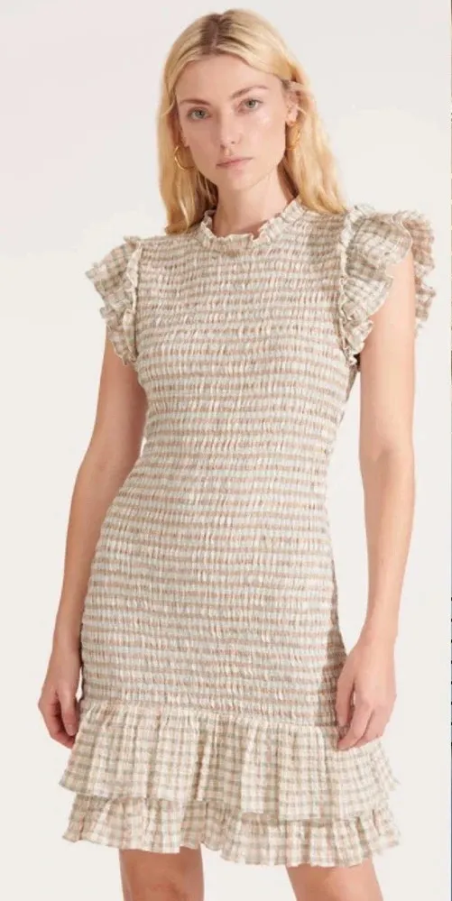 Brand new with tags Veronica Beard Cici Smocked Seersucker Minidress. Flutter sleeves and tiered ruf... Show more