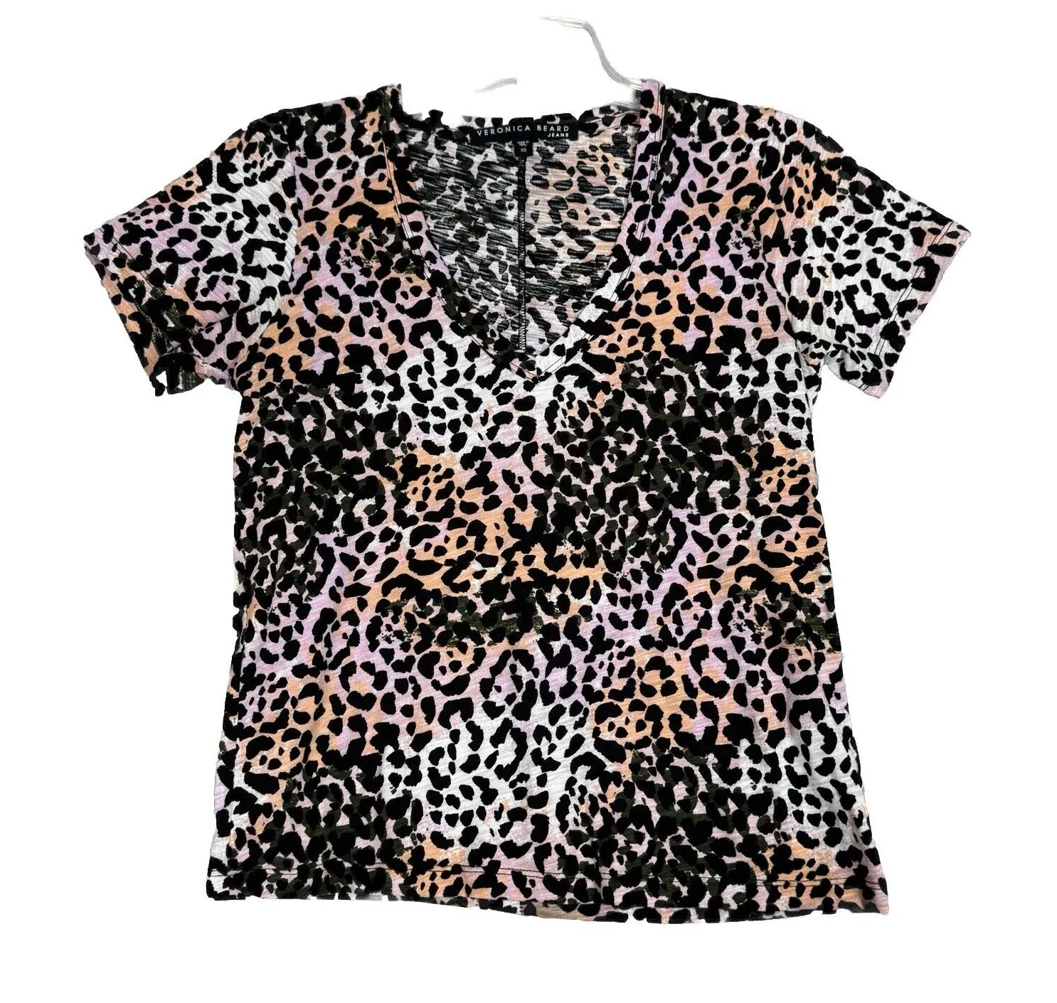 Veronica Beard Shirt Womens XS Pink Black Leopard Cheetah T Shirt Tee Casual Women's Size XS Extra Small Short Sleeve V-Neck Lightweight Pullover Style 100% Pima Cotton Everyday Basic Easy Wear Edgy Fun Punk Rocker Easy Wear Updated Basic Measurements are Approximate: Length 23" Armpit to Armpit 18" Gently Used Condition. No Rips Tears or Stains.