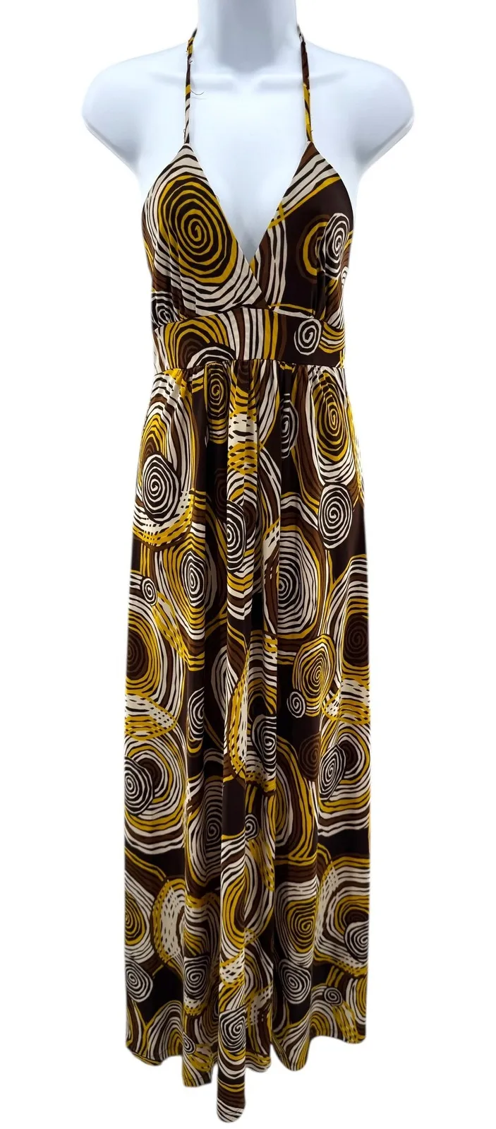 Channel vintage mod meets modern in this Veronica M halter maxi dress, size Large. A true showstopper, this dress features hypnotic swirls in chocolate brown, mustard yellow, and cream—perfectly capturing the 1960s/70s psychedelic aesthetic. With a plunging neckline, empire waist, and open back, this dress hugs in all the right places while offering effortless retro glamour. Great for mod-themed parties, statement festival fashion, or throwback-inspired travel looks. • Label: Veronica M. • Size: Large • Colors: Brown, mustard, cream • Print: Bold retro swirl / mod spiral • Style: Halter neckline, plunging V, open back, empire waist • Material: Soft stretchy jersey • Condition: Good pre-owned –loose strings on hem and neck tie Measurements (laid flat) • Length (from shoulder to hem): 56" • Pit to pit: 16" mod style, 60s inspired, psychedelic print, retro swirl, bohemian glam, y2k revival, Veronica M dress, halter maxi dress, fall festival outfit, mid-century modern vibes, groovy dress, earth tones, retro chic, swirly pattern, studio 54 aesthetic, bold print maxi, vintage revival, open back dress