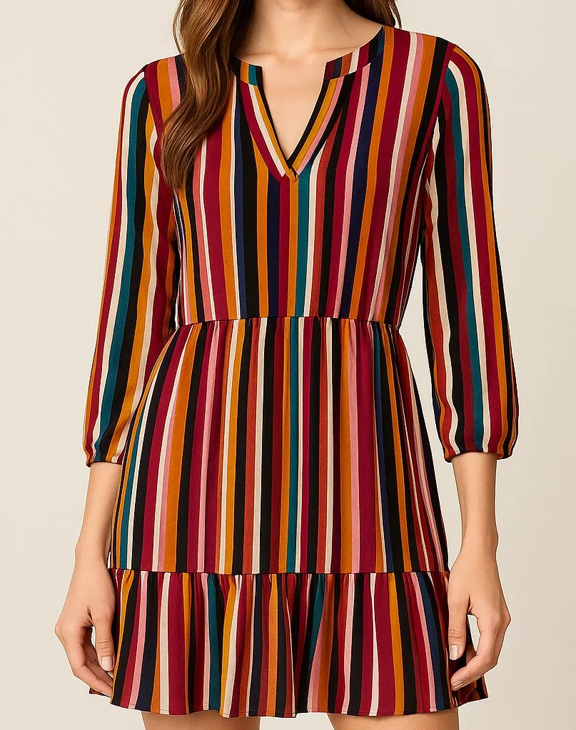 Add a pop of color to your wardrobe with this Veronica M striped mini dress! Designed in a drop-waist silhouette with a lightweight polyester blend, this easy pull-on style offers comfort and versatility. Pair it with boots, heels, or sandals for a bold yet polished look. Soft stretch fabric with bright vertical stripes that elongate the figure. Features a flattering V-neckline, elastic waist, 3/4 sleeves, and a feminine ruffle hem. Effortlessly chic for brunch, date night, or vacation wear.