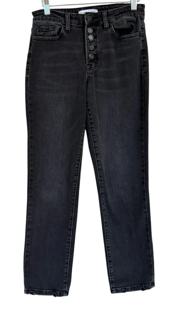 Modern, stretchy faded black (or dark grey) jeans. Ankle length, with a straight leg, and high rise.... Show more