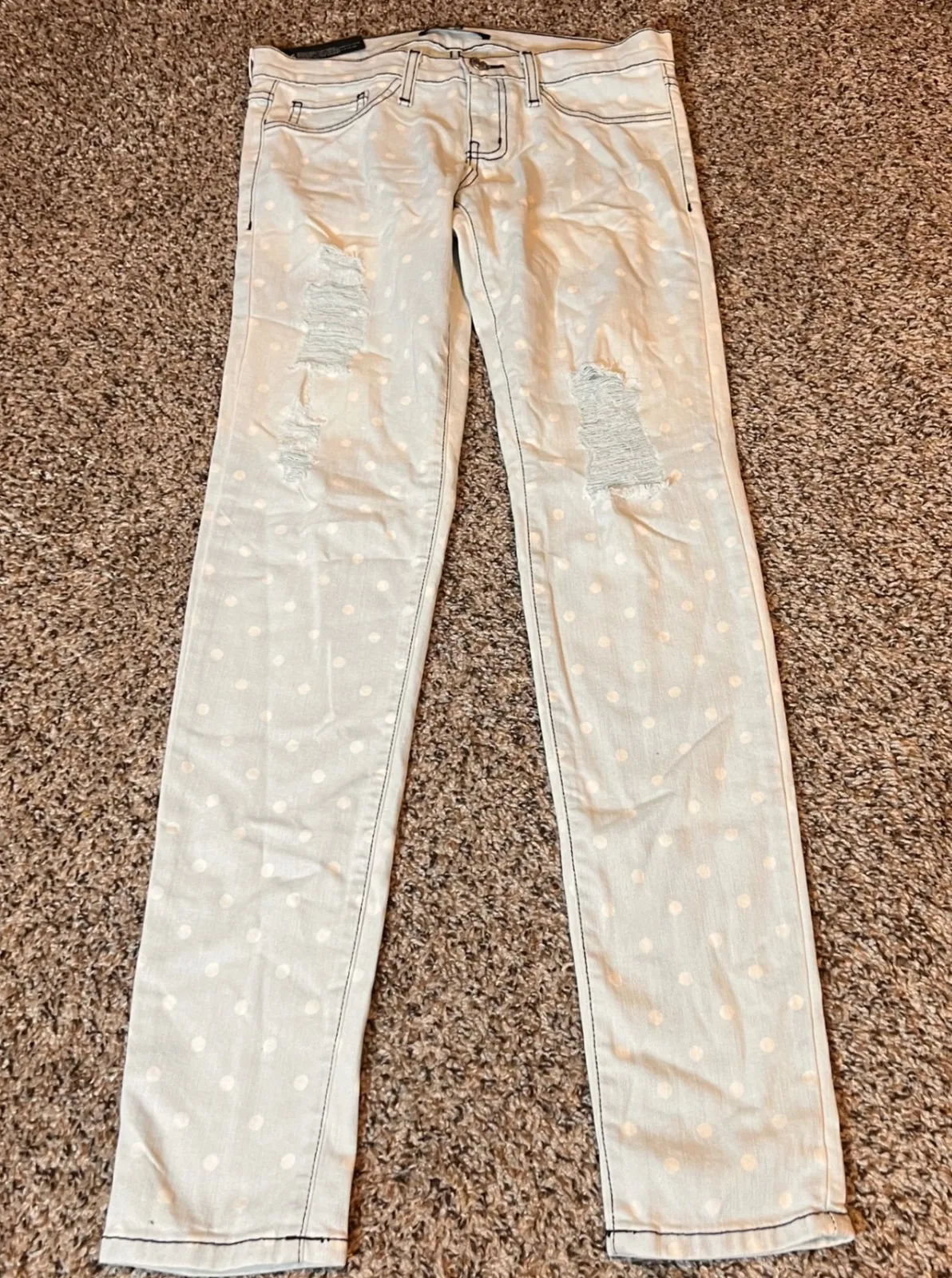 Keywords: Flying Monkey jeans, polka dot jeans, distressed jeans, ripped jeans, light wash jeans, denim jeans, casual jeans, womens jeans, size 26 jeans, stylish jeans, trendy jeans, fashion jeans, denim pants, womens pants