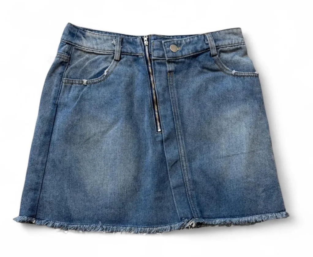 Denim Zipper Fringed Skirt. Features an off center zipper and minor distressing including slight fringe at hemline. Button and zipper closure with front and back pockets. 100% Cotton. #denimminiskirt #distressedmini #miniskirt #fringeskirt #veryj