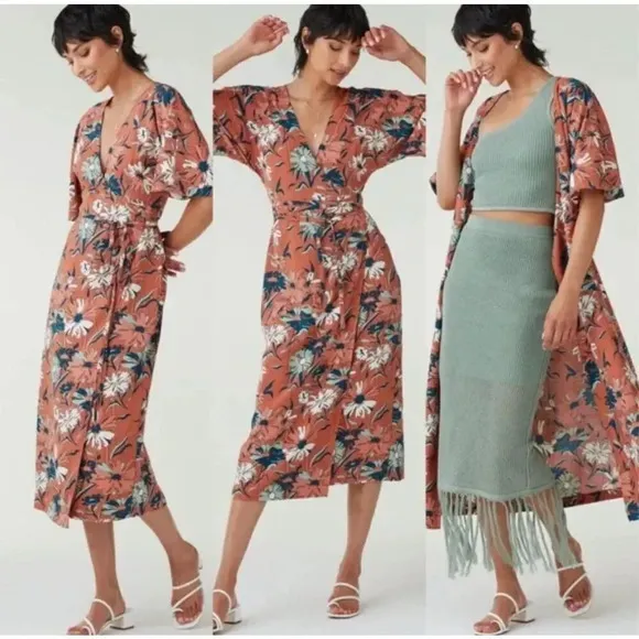 Stunning convertible wrap dress from VETTA! Size medium, worn once. Color is a muted terra cotta pink with mint green, navy and white floral print. Short dolman sleeve. Approx. Flat Measurements: •Armpit to armpit...23" (approximate, across back, dolman sleeve does not allow for exact) •Top of Shoulder to hem...52" •Top of Shoulder seam to cuff...17.25" From VETTA: This wrinkle-resistant dress is a chic necessity for your next summer destination. In a new color (azure blue!!) and a new pattern (retro floral print!!), this piece will be the wild card in your closet that keeps things fun. With various slits on the dress and extra long ties, you can criss-cross the ties in front, cinch the top for a deep-v look, wear it open as a duster, or wear the wrap portion in front or back. This dress will have you prepared for everything from pool lounging to a fancy dinner on your next summer escape.