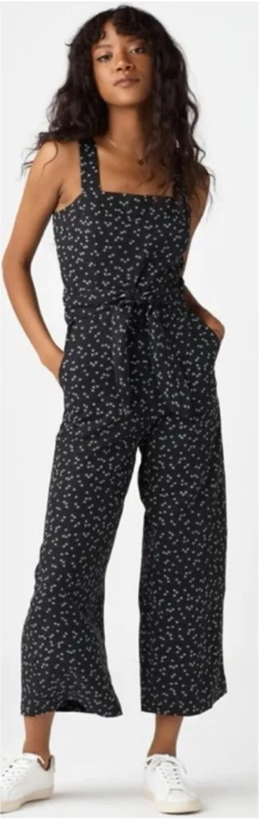 VETTA The Apron Jumpsuit in size 18. A versatile two-piece set that can be worn as a jumpsuit or separates—features wide-leg pants and a convertible top with tie-back detail. Made in the USA from sustainable materials. Minimalist, functional, and travel-ready. Pre owned condition. Discoloration in the junction of pant legs. See photos VETTA, two piece jumpsuit, apron jumpsuit, convertible, floral print, size 18, wide leg, crop top, sustainable fashion, made in USA, capsule wardrobe, ethical brand, minimalist