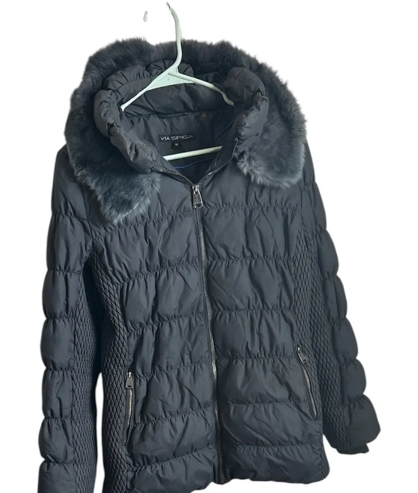 Elegant charcoal gray puffer with cozy faux fur hood. Ideal for cold weather. Woman’s size Medium Call out ** One of the pockets in the front has a hole on the inside making it unusable to put anything in but the other pocket is perfectly fine!