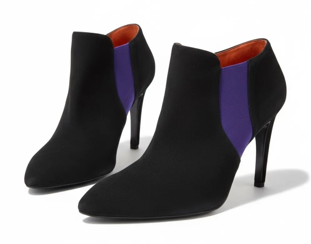 Via Spiga Blaire Suede Booties in Black + Violet Size 38 Immaculate Preloved Condition Worn once ✿ Magnificently styled suede booties feature a bold pop of color contrasting on smooth black suede. Sculptural heel. J’adore ❤︎︎ Fabrication: Suede upper + Leather lining + Leather sole Contrast stretch gore insets at sides Approximate Measurements: Heel: 3.5” ✿ Luxe Luxury Suede Leather Patent Clear Textile Jelly Canvas Stiletto Wedge Kitten heel Espadrille Slouch Slouchy Knee high boot Ankle boot Booties Moto Combat Pumps D’Orsay Ballet Flats Oxford Brogue Wingtip Miller Flip Flop Thong Toe Open Toe Slingback Platform Ankle Strap Gladiator Caged Pointy Toe Zip closure