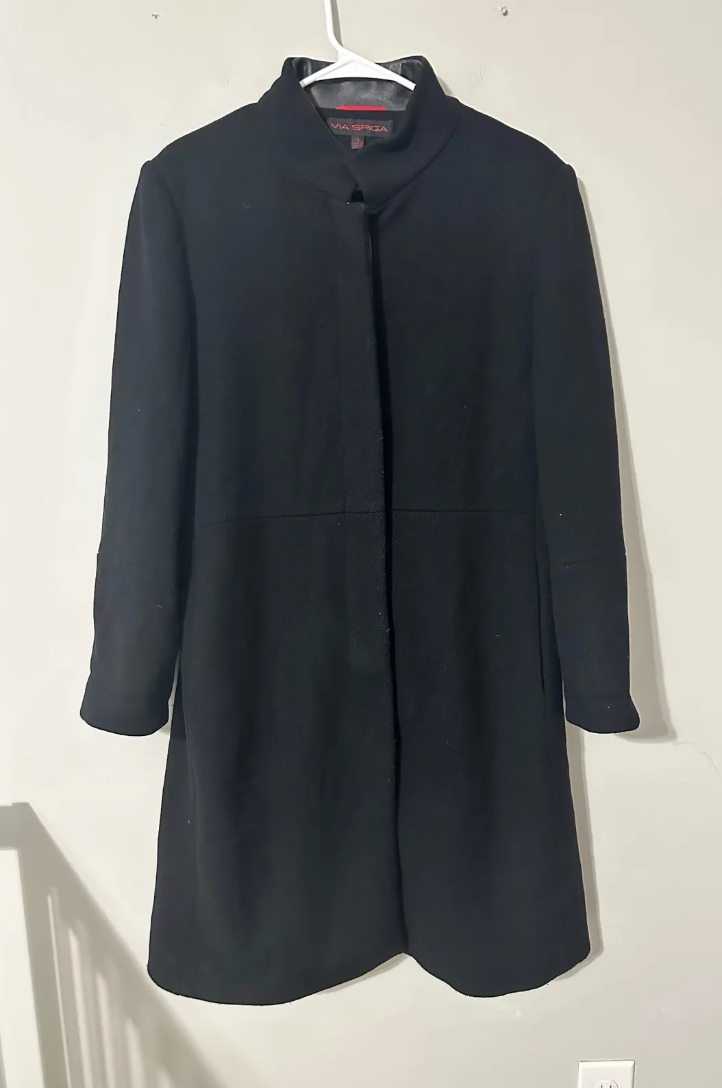 Type: Coat Outer Shell Material: Wool Style: Overcoat Department: Women Lining Material: Polyester Theme: Flower Fabric Type: Tweed Features: Collared, Pockets Accents: Button Pattern: Solid Insulation Material: Wool Season: Fall, Winter Closure: Button Occasion: Casual, Business Keywords: Via Spiga coat, womens wool coat, black coat, size 12 coat, dress coat, winter coat, wool blend coat, floral lining coat, stylish coat, womens outerwear, classic coat, designer coat All pre owned clothing will be cleaned according to care instructions with unscented detergent. All items stored in polybags Comes from a smoke free home
