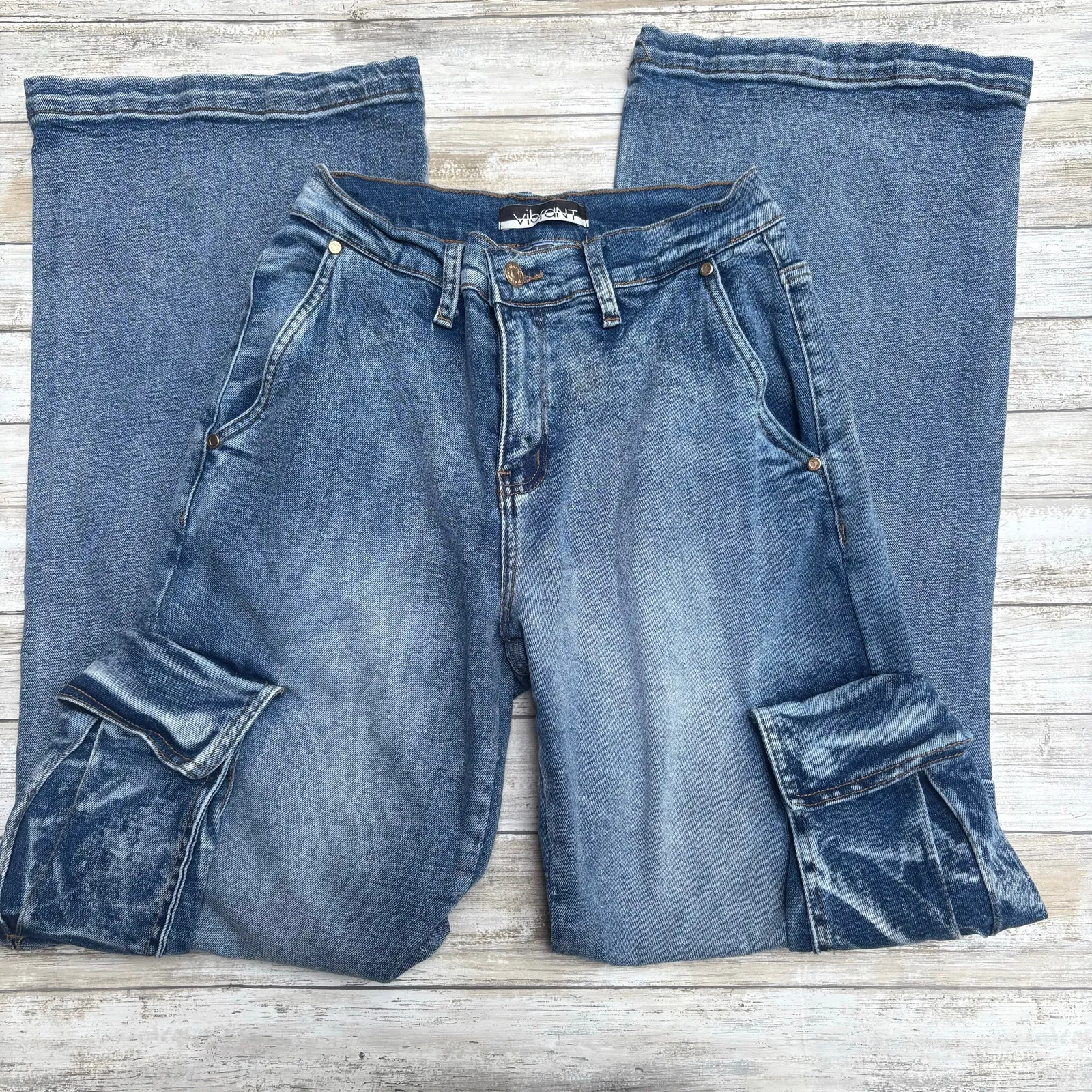 Vibrant MIU Size: Small Material: cotton/spandex blend with some stretch. Color: medium wash blue denim Style: skater, Y2K, baggy, cargo, emo, grunge Fit: high rise, side cargo pockets with snap closure, 2 hip pockets, 2 seat pockets, zip and button fly, wide, straight leg Measurements are approx. and taken lying flat. Waist 12.5” Front Rise 10” Inseam 32” Leg opening 10” Ships from a smoke free, pet friendly home. Steam cleaned prior to listing. Condition notes: good preloved condition. Gently used. Photographed in natural light. Color may vary under different lighting conditions. Please see images for exact condition, Happy to send more details if requested! Offers welcome.