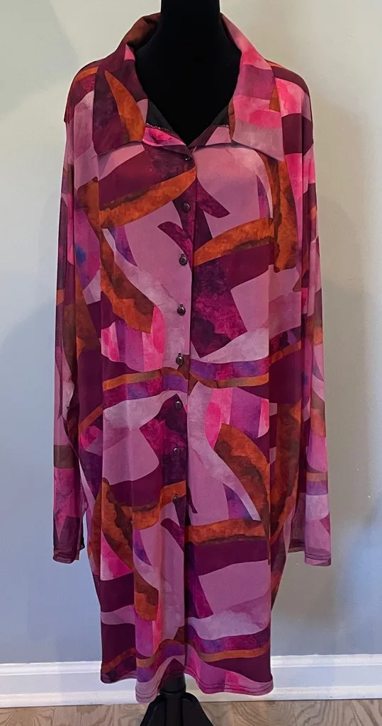 Stylish button-up dress with a vibrant abstract pattern in pink and orange hues. Perfect for a bold... Show more