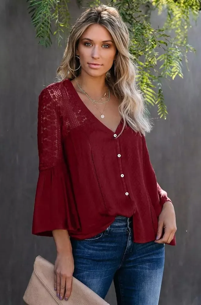 VICI Lovestitch Du Jour Crochet Bell Sleeve Button Front Boho Top Flowy. Merlot Burgundy. Size mediu... Show more