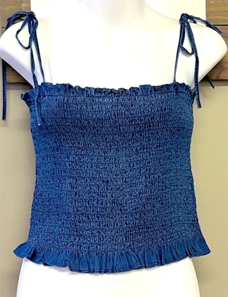 Never worn, adorable! Vici Vintana Smocked Tencel Cropped Straps Tank Top- Denim Blue- Large Fit... Show more