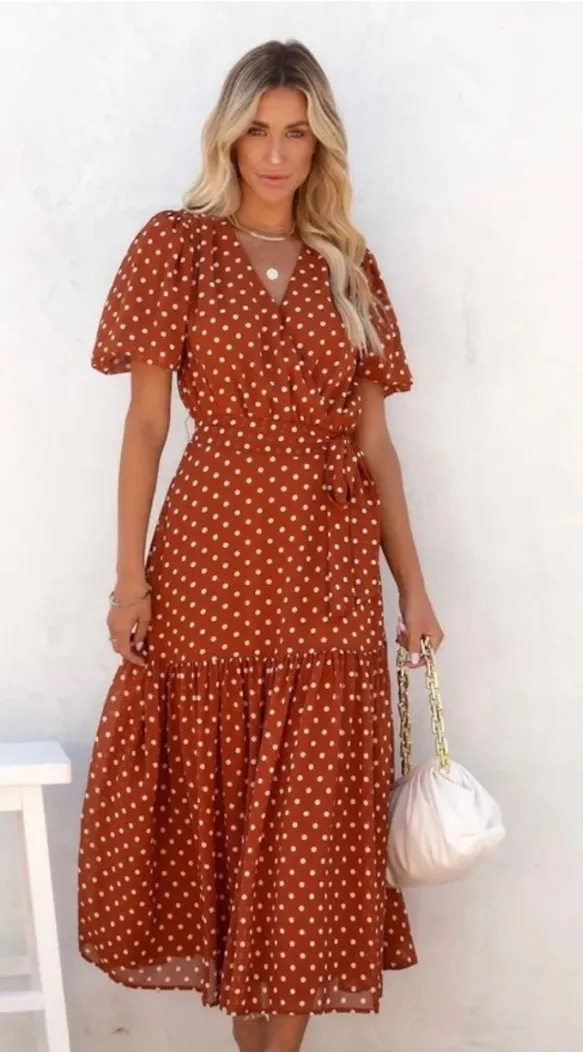 Charming midi dress evokes a sense of effortless chic. A flattering wrap silhouette with a self-tie... Show more