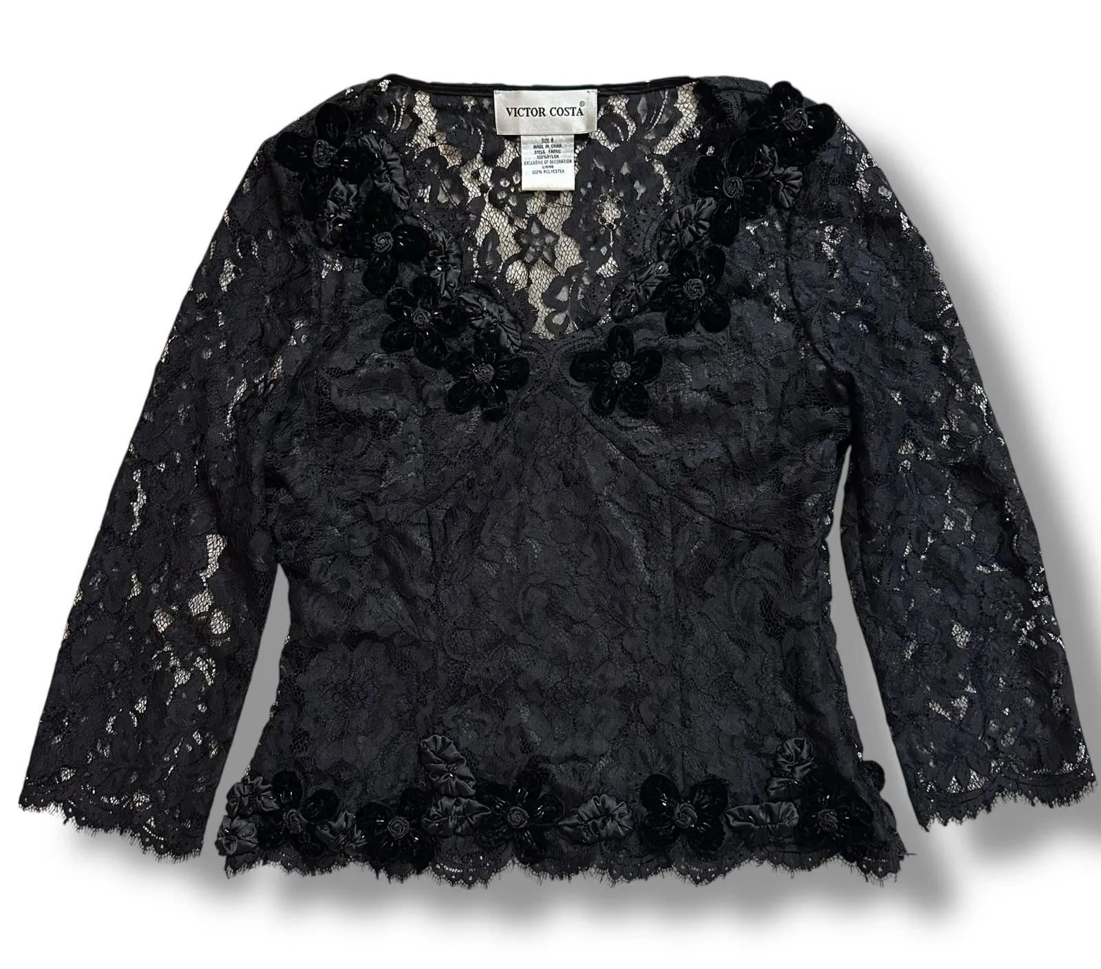 Elegant Victor Costa black lace blouse featuring intricate floral lace throughout with dimensional floral appliqué details along the neckline and hem. Semi-sheer lace sleeves with a lined body for coverage. Romantic V-neck silhouette with a fitted, flattering shape. A statement piece perfect for cocktail events, evening wear, or formal occasions. ~ Size 8 | Shell 100% Nylon, Lining 100% Polyester | Made in China | Dry Clean Only | Measurements taken flat: Chest 17.5” • Length 21” | Pre owned in great condition. * Original retail price $150 #victorcosta #lacetop #eveningwear #gothicstyle #romanticfashion #statementtop black lace blouse women, floral applique lace top, evening lace blouse, cocktail lace top, gothic lace blouse, romantic lace top, formal lace blouse, semi sheer lace top, designer lace blouse, special occasion top, victorian inspired lace, statement lace top