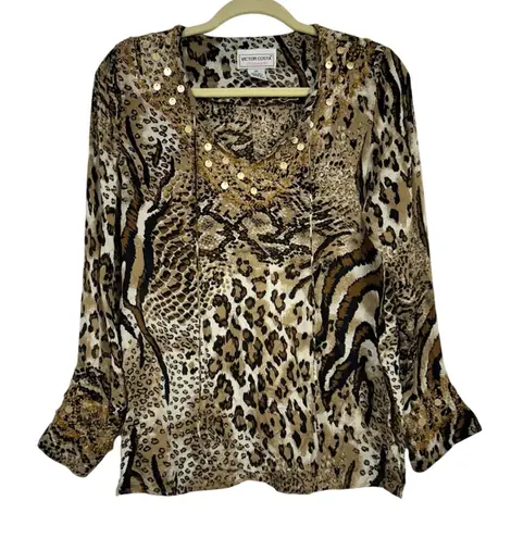 Victor Costa Silk Animal Print Silk Beaded Blouse Womens XS Tunic Vintage Brown - $30 - From Lisa