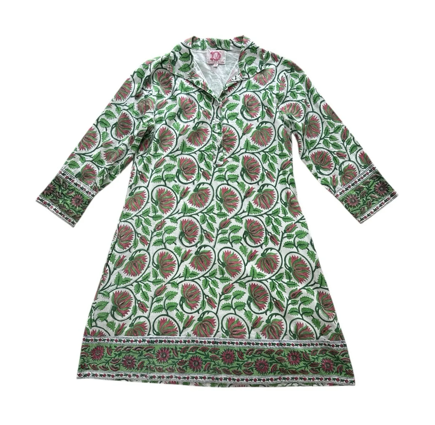 The Victoria Dunn Shirt Dress in Green and Pink Block Print Floral is a stylish and versatile piece perfect for various occasions. Made from 100% cotton, this midi-length dress features a collared neckline, 3/4 sleeves, and a button closure. It is lightweight, lined, and has pockets in a shift sinhouette and shirt dress style, embodying themes of Charleston, Bohemian, Coastal, Southern, and Preppy aesthetics. Chest: 18: Waist: 17" Length: 34"