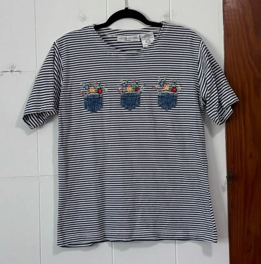 VICTORIA JONES Top Blue White Stripes Short Sleeve Jean Pockets Flowers Cotton P Size undefined - $12 - From Molly