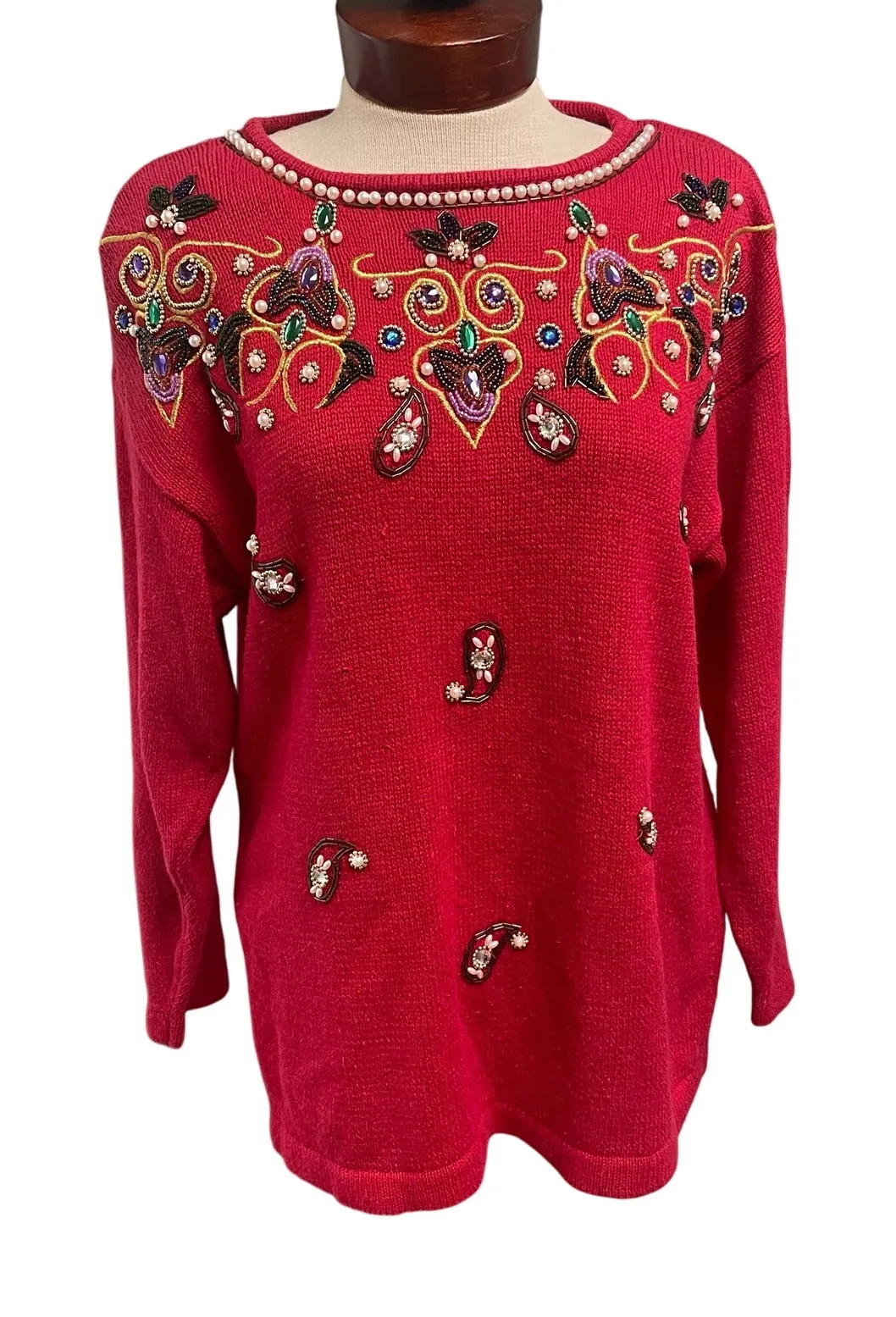 Excellent condition red long sleeve tunic length sweater- Vintage Victoria Jones Made from a Ramie/Cotton blend--Has gorgeous beading and embellishments throughout the front Great for the upcoming holidays! VTG 90s Vibes Modest Heritage Retro Glam Bling Shiny Maximalist Eclectic