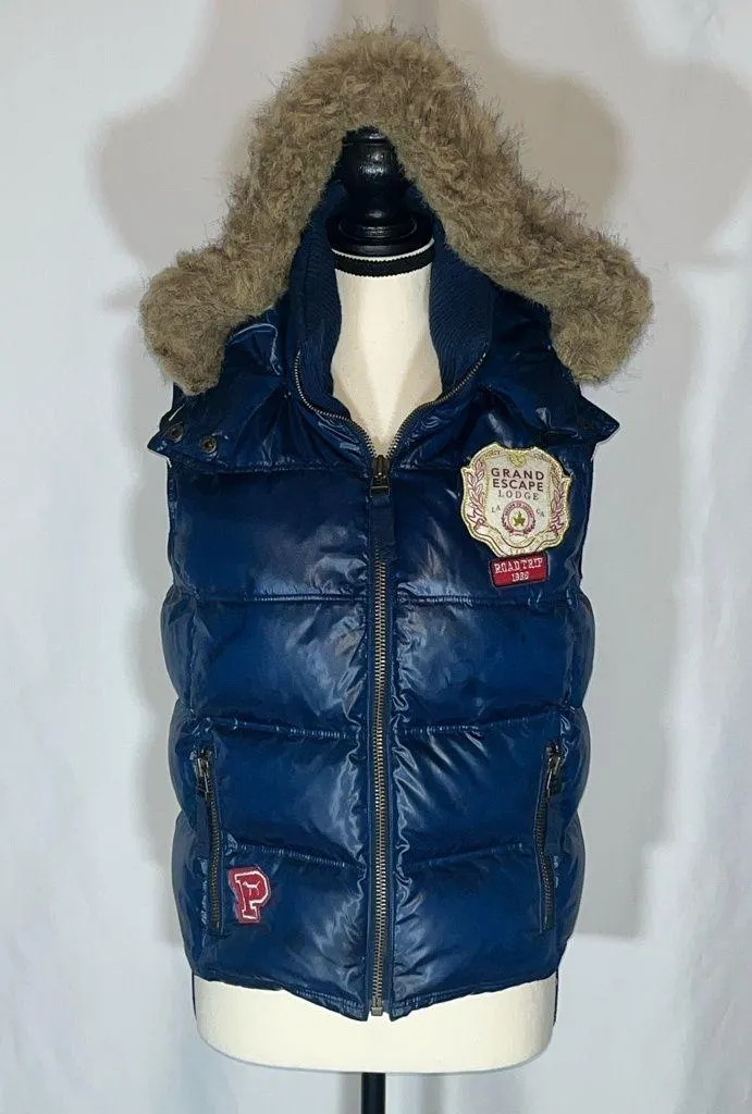 The Victoria Secret Grand Escape Lodge Puffer Vest with a Faux Fur Hood is a stylish and cozy outerwear piece designed for women. Made of polyester, this vest features a puffer jacket style and comes in a beautiful blue color. Perfect for colder weather, this vest is hooded for added warmth and comfort. Available in size Small, this regular fit vest is a fashionable and functional addition to any wardrobe.