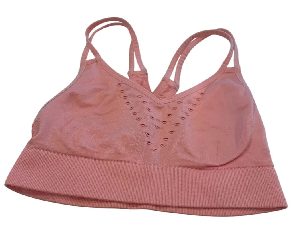 Pretty peachy pink coral lightly worn sports bra - sz small. 1.75” band across bottom; 11.5” width laid flat. - stretch straps for the perfect fit. Everything will stay in place and you can fully concentrate on aiming high! - all over cutout design adds style and breathability across the back. Limited cutout design on front adds extra style - breathable fabric and cropped length will keep you cool and won’t hold you back during your sweat sessions. - Offering moderate support, it is perfect for activities like running,hiking,training, and versatile enough for everyday casual wear. The perfect combination of functionality and style. - flexible four-way stretch fabric that supports your body as you move. Sports bra with wide waist band for that support we all need!