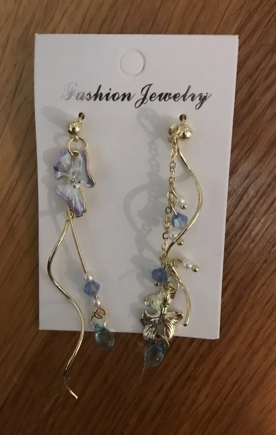 - Beautiful gold-colored earring (zink alloy) - Metal blue flowers, chains, spiral & blue rhinestones - Please note that these are asymmetrical (different for each ear) - Stud style for pierced ears - Brand new in the original baggie - One size, top of hook to bottom ~ 3"