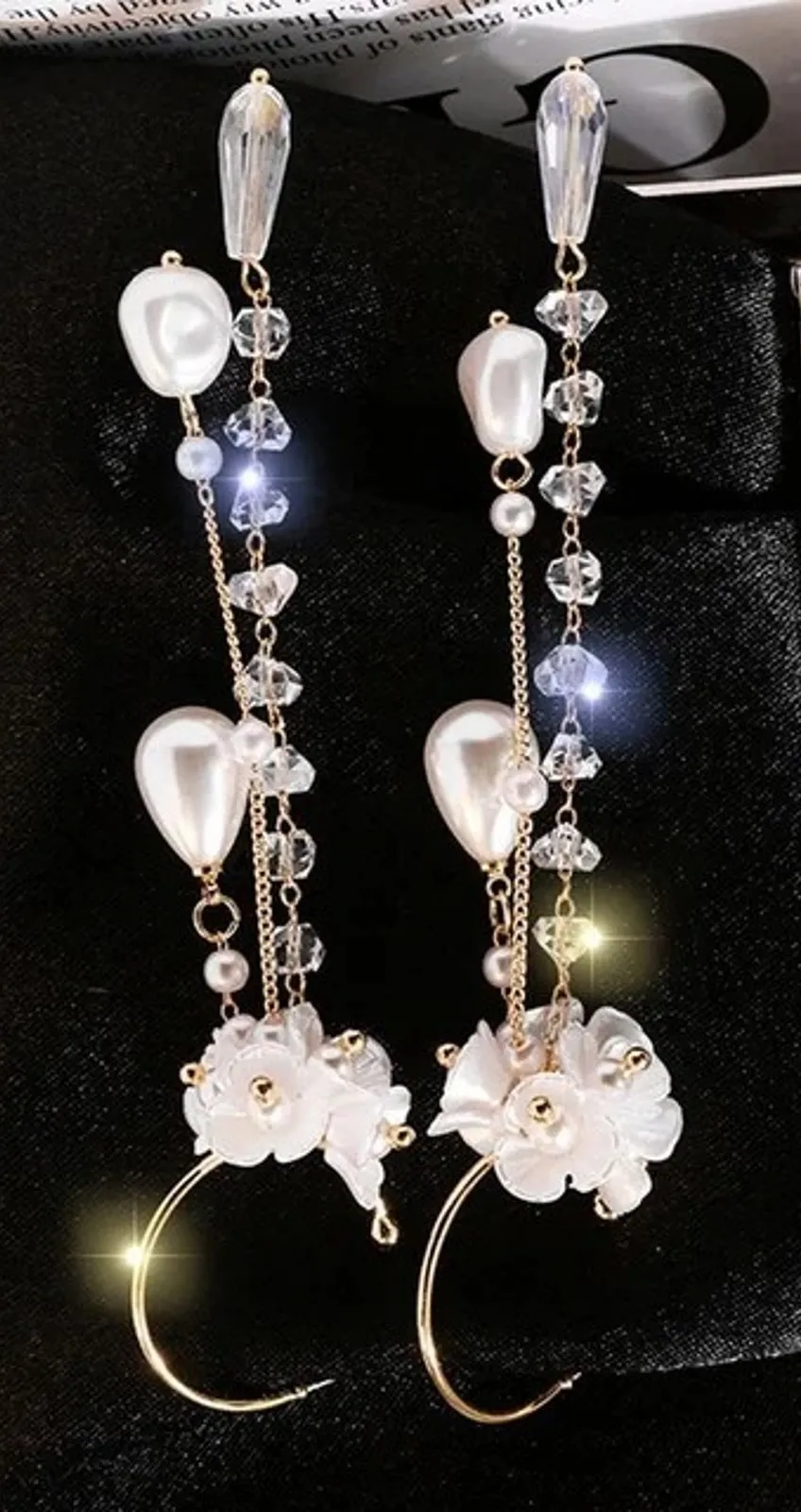 - Beautiful gold-colored earring (zinc alloy) - Elegant cluster of white flowers on top - Large faux pearls & rhinestones (please note that all the stones are transparent or white, NOT blue, this is just a weird glow in the first picture) - Round hoops on top - Brand new in the original baggie - One size, top of hook to bottom ~ 4.25"