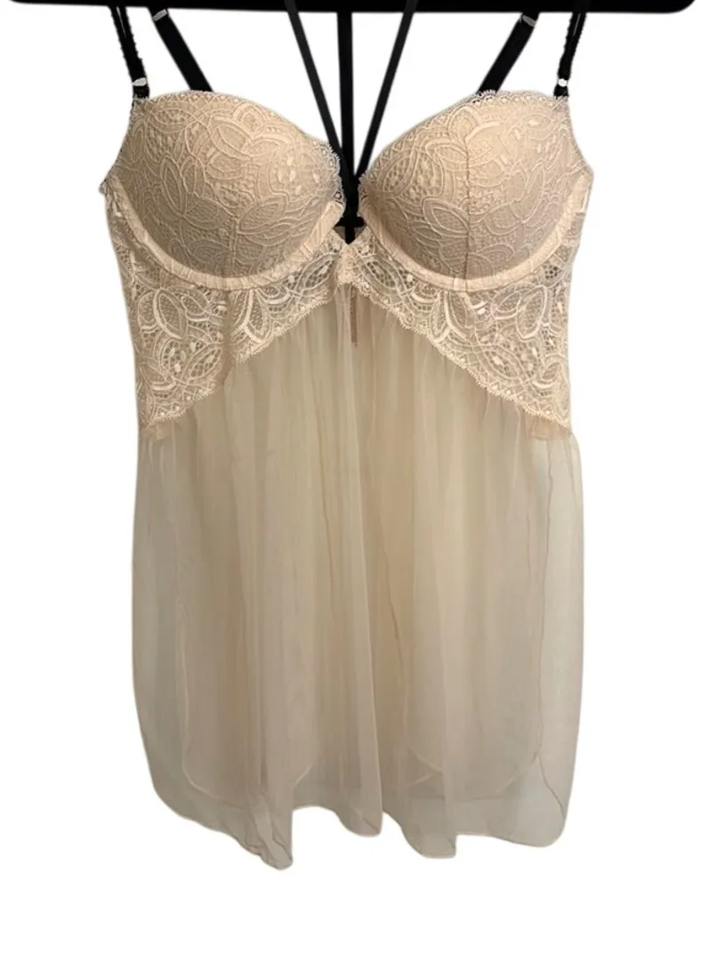 Victoria's Secret Babydoll in Blush Pink and Black with padded underwire cups and floral lace overla... Show more