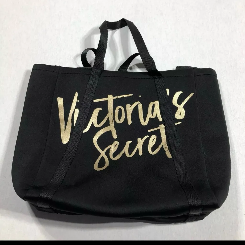 This elegant Victoria's Secret tote bag showcases a sophisticated black and gold color palette, high... Show more