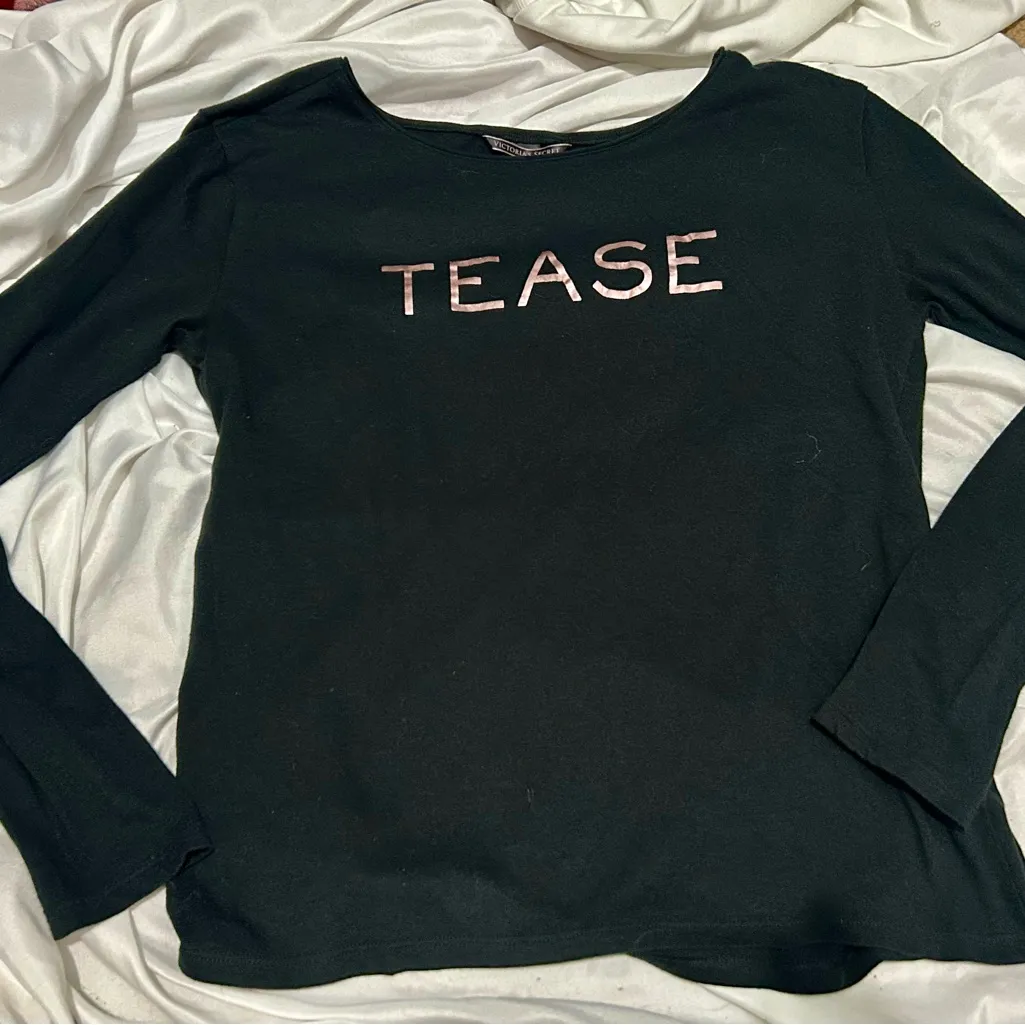 Chic black long sleeve tee. Features bold pink 'Tease' lettering. Ideal for casual wear. Vintage bla... Show more