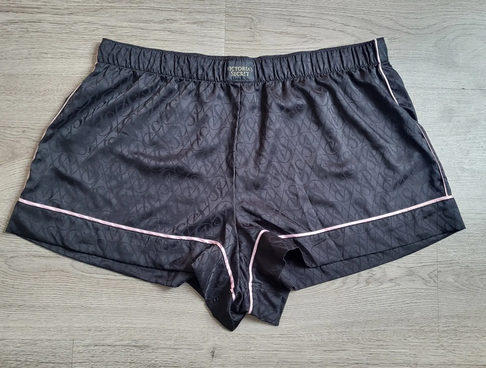 Victoria's Secret satin sleep shorts in black featuring a repeating 'VS' logo print. These comfortab... Show more