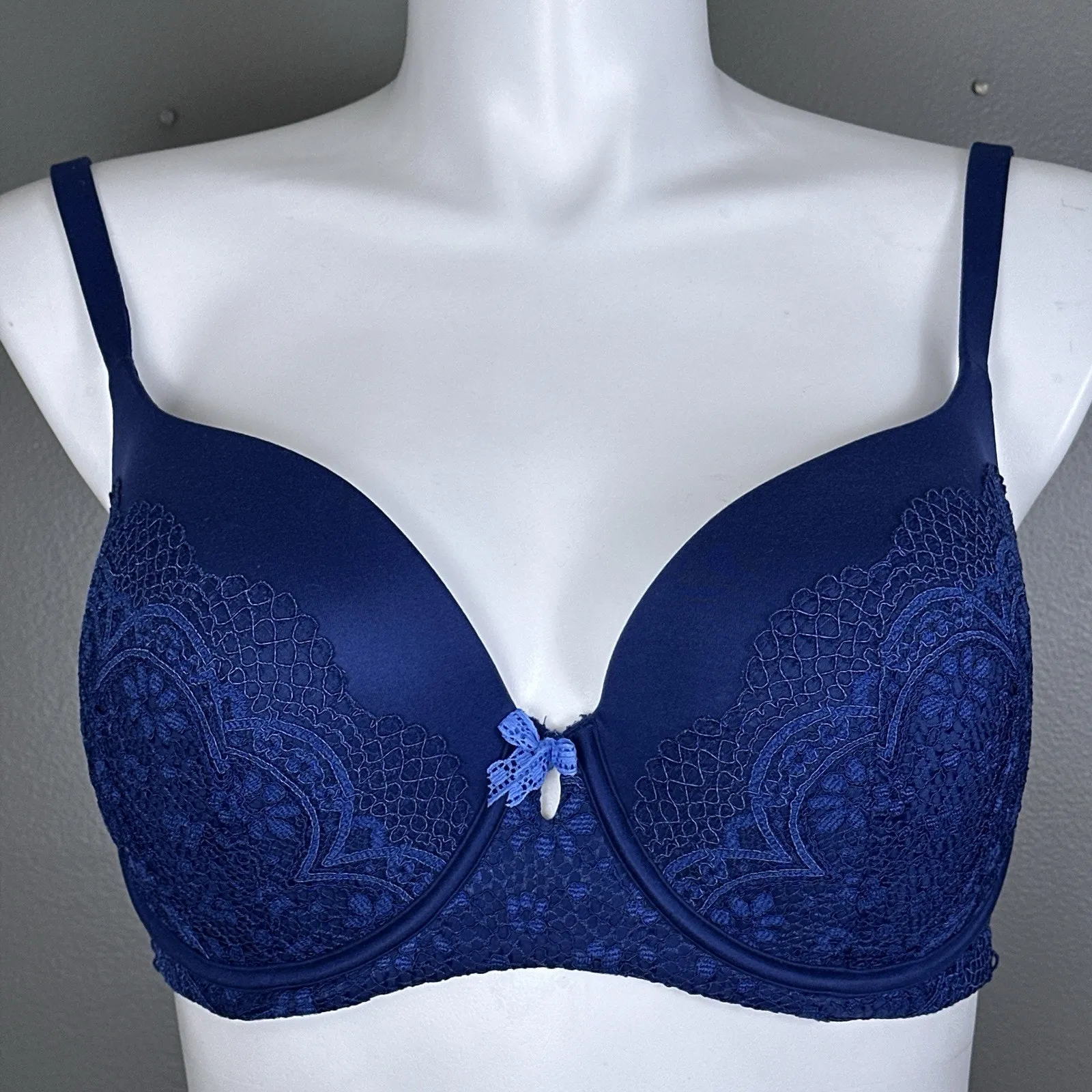 Listed is a Victoria's Secret Body by Victoria Lined Demi bra, dark blue with lace overlay on molded... Show more