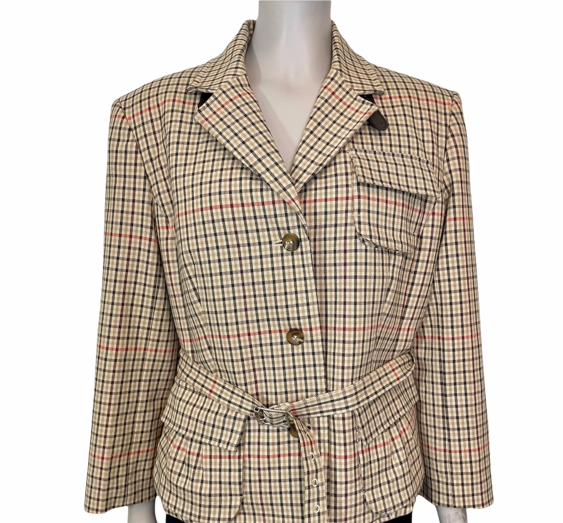 Body By Victoria tan plaid blazer jacket with front button closure. Optional belted accent detail at... Show more