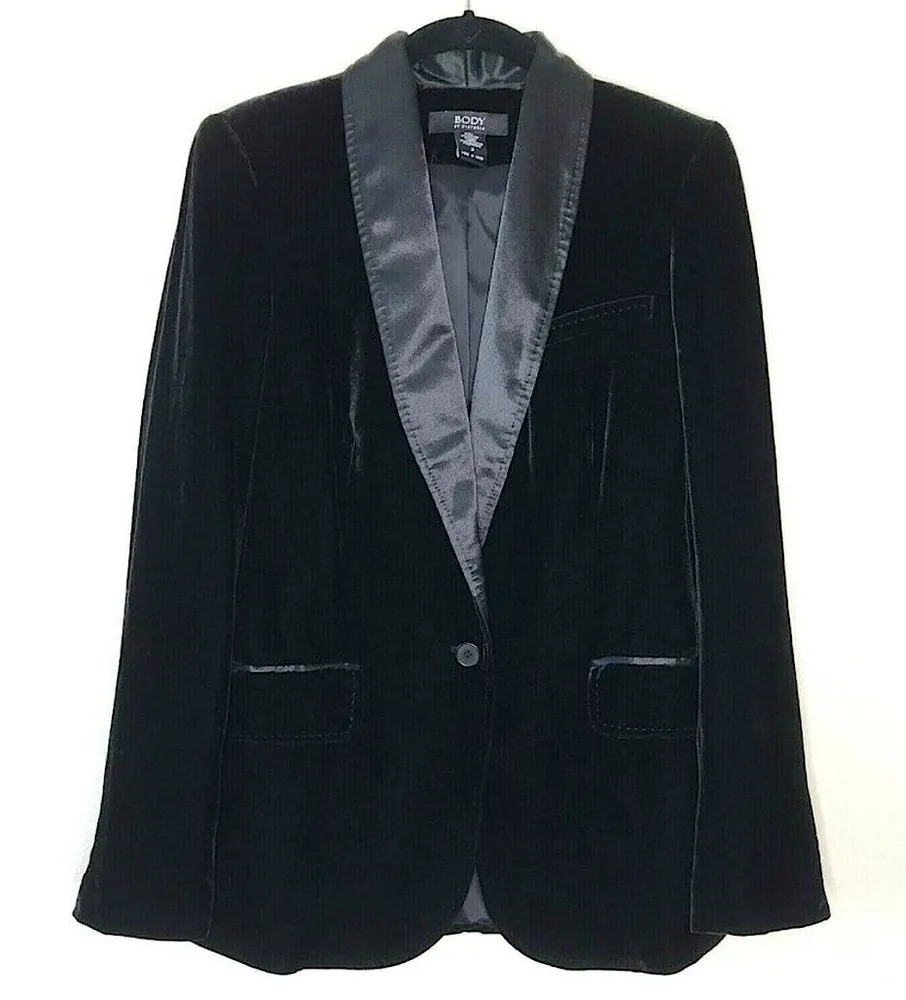 Victoria’s Secret BODY by VICTORIA Velvet Silk One-Button Blazer Jacket Black 6. Silk trim at the collar. One button closure. Delicate tonal stitching at the pockets and cuff and hem. Luxurious velvet. 4 buttons at the cuffs. Non removable shoulder pads. Back slit. Fully lined. Approx measurements: 17“ pit to pit & 25.5“ length. Great pre-owned condition. No stains/flaws. Smoke/pet free home. Offers welcome. Bundle & save. Ship same/next day. Packaged w/ care.