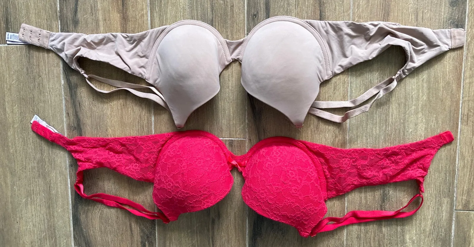 2 pack of Victoria's Secret bras from T-shirt collection, demi. This is a beige bra and red with al... Show more