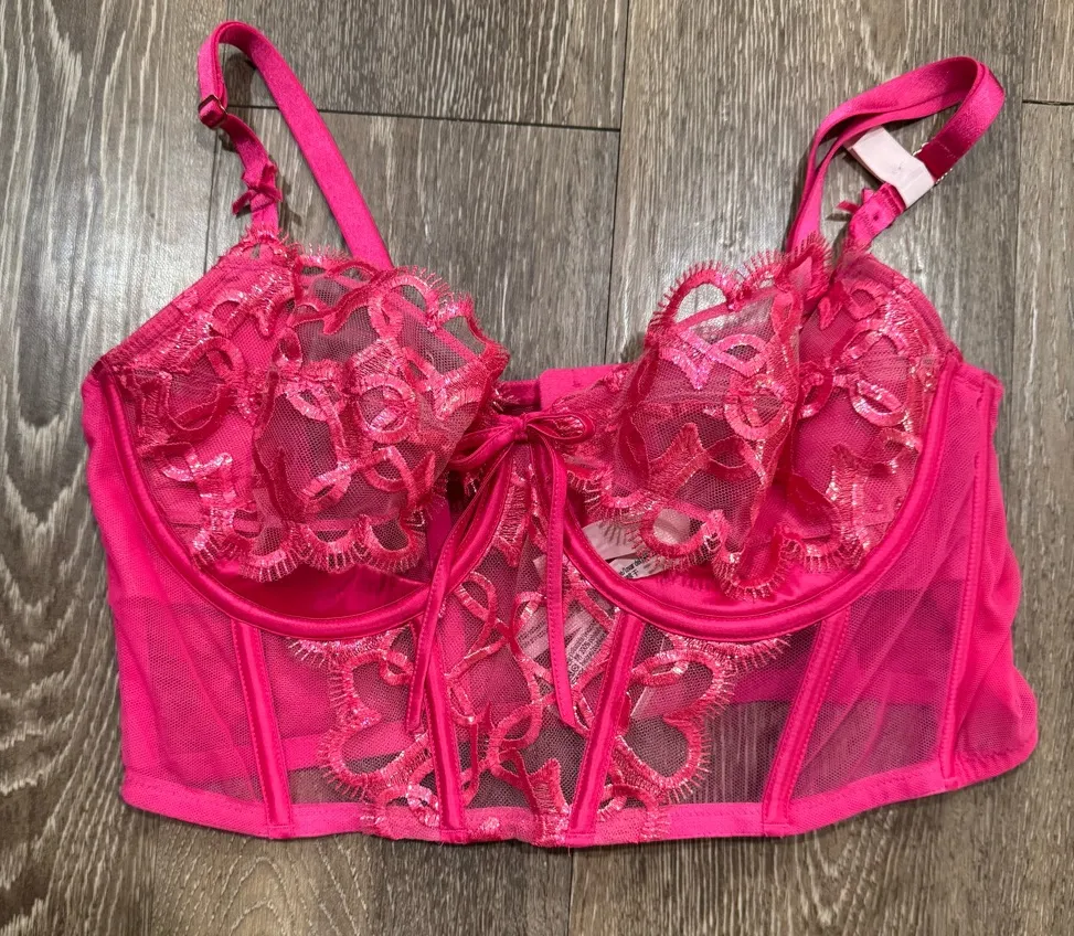 Vibrant hot pink lace bustier with intricate detailing. Perfect for a bold and stylish look. Victor... Show more