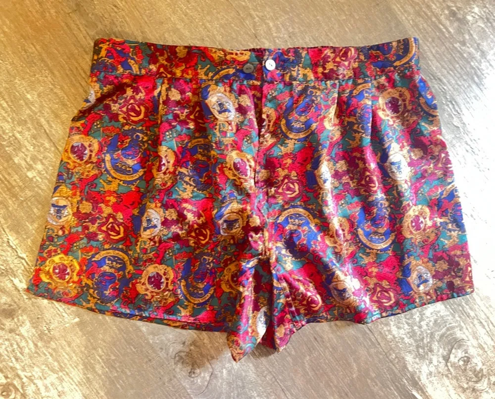 Buttons in the front with two interchangeable buttons to adjust sizing Elastic waistband Paisley a... Show more