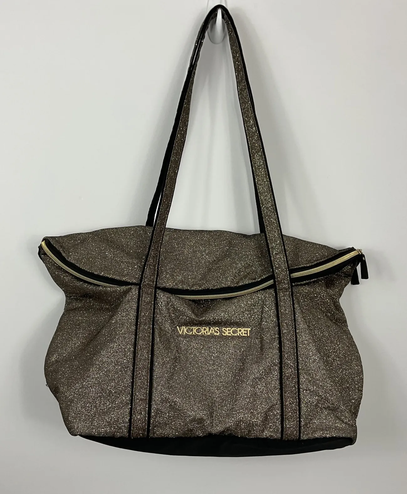 Sparkling shimmer tote from Victoria's Secret. This eye-catching bag features black trim and straps,... Show more