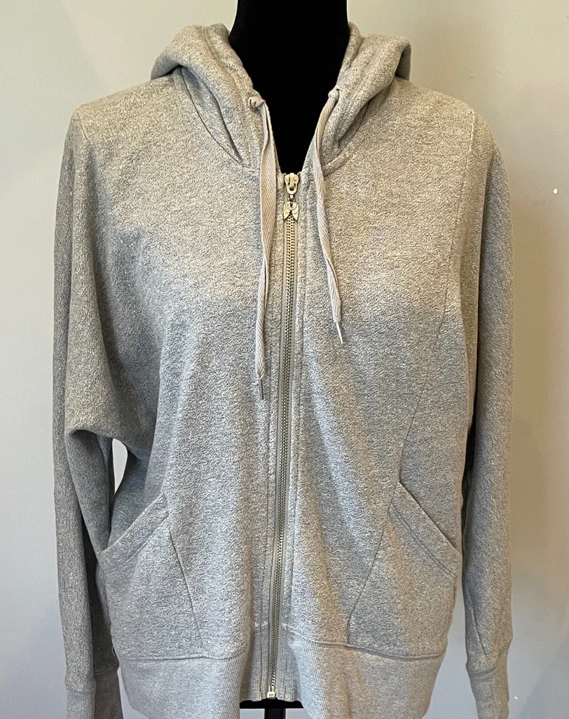 Comfortable gray zip-up hoodie with front pockets and drawstring hood. Cute casual everyday jacket... Show more