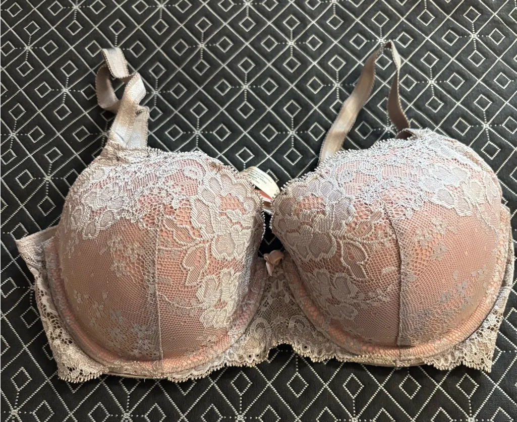 Chic lace bra with underwire support. Features a pink base with gray purple overlay. Ideal for every... Show more