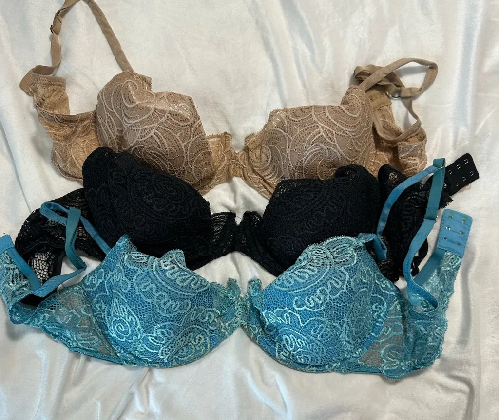 Chic lace bras in black, tan, and blue. Offers style and support. Ideal for any occasion.