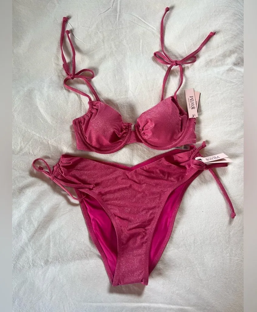 NWT Victoria’s Secret pink swimsuit set. Ruched shine underwear adjustable top size 32D and Ruched s... Show more