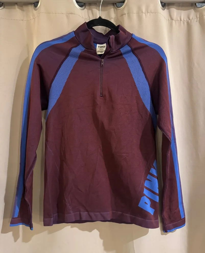 Chic maroon pullover with blue details. Features a quarter-zip front. There is a small discoloration... Show more