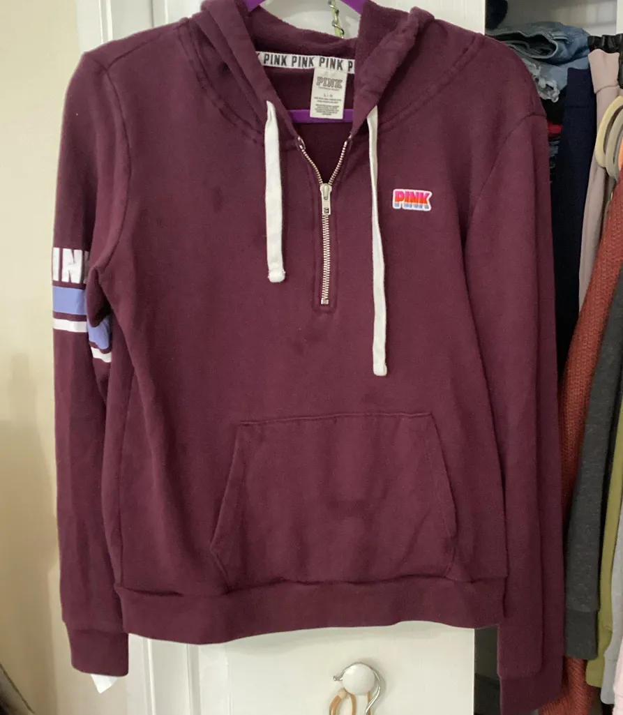 Cozy maroon hoodie with white drawstrings. Features a front zipper and Pink logo on the inside colla... Show more